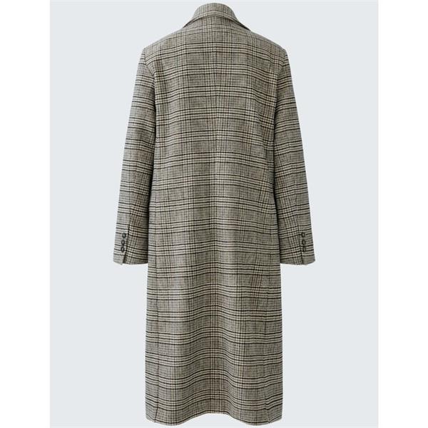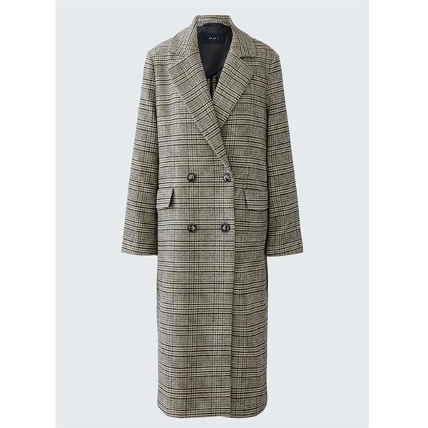 The coat features a stunning fabric woven in checks, providing a sophisticated texture that stands out. With its straight cut and regular length, it fits perfectly over any ensemble—from casual to refined. The classic lapel collar adds a touch of refinement, while the double-breasted design, adorned with high-quality horn-look buttons, ensures both style and durability.