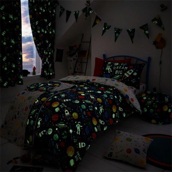 Explore the galaxy with this space-themed, glow in the dark duvet cover and pillowcase set.