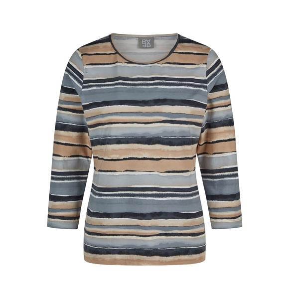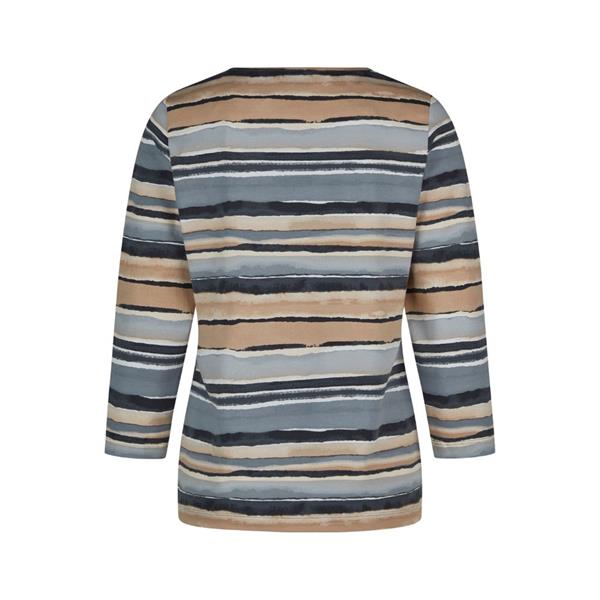 This RABE top showcases a watercolor-inspired stripe design in soft natural tones, adding subtle elegance to everyday outfits. Made from a stretchy cotton blend with a smooth outer finish, it feels comfortable while retaining its shape. The round neckline and 3/4-length sleeves complete the versatile look, making it an easy-care favourite for relaxed styling.